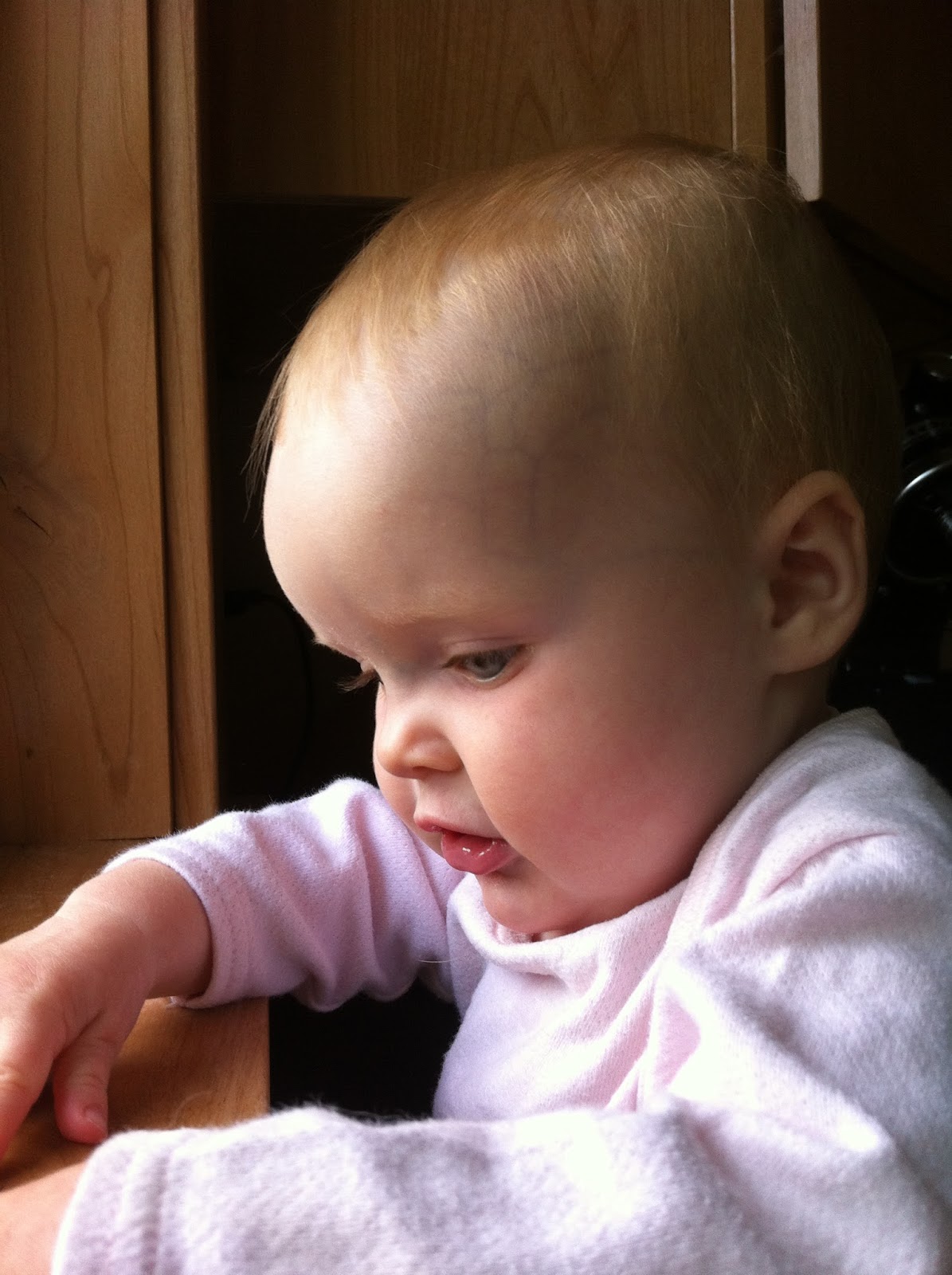 There’s still no crawling taking place. Tess gets frustrated very quickly when put on her tummy or on her hands and knees; she flips over onto her back almost immediately. But she is starting to lead out with her hands a little while she’s sitting up. So she’ll be getting there. She likes to stand up while you hold her hands and will walk a few steps that way too. I think she is very close to pulling herself up to standing. We don’t have very many suitable places for her to do this (no coffee table, for instance), so maybe that’s why it’s taken her a little bit more time to master that. She has her 9 month check-up early next week, so I’ll be able to report on all her stats next post. We just love our baby girl!