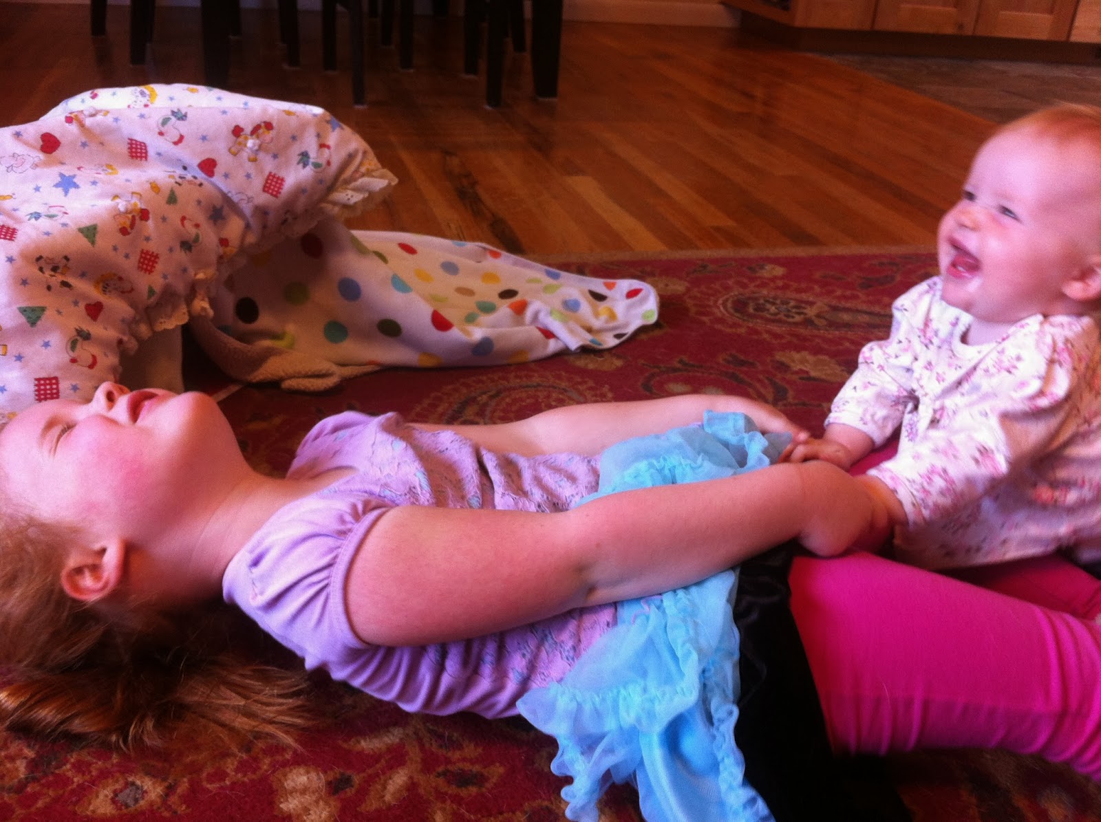 So I’m behind in my posting schedule. For Tessa and definitely for Maggie. So we’ll just put them together today and revel in their sisterhood. They love each other. Tessa is absolutely enchanted by Maggie; she looks to her already for cues on what to do and how to react. If Mags gets close in to Tess and interacts in some way, you can just watch Tess open up and sponge it in. She crawls to be closer to her, to follow her, to get her attention. Maggie has started to pick up on it and will say things like “Tessa wants to bounce up here on the couch like me, Mommy.” Yes, she does.