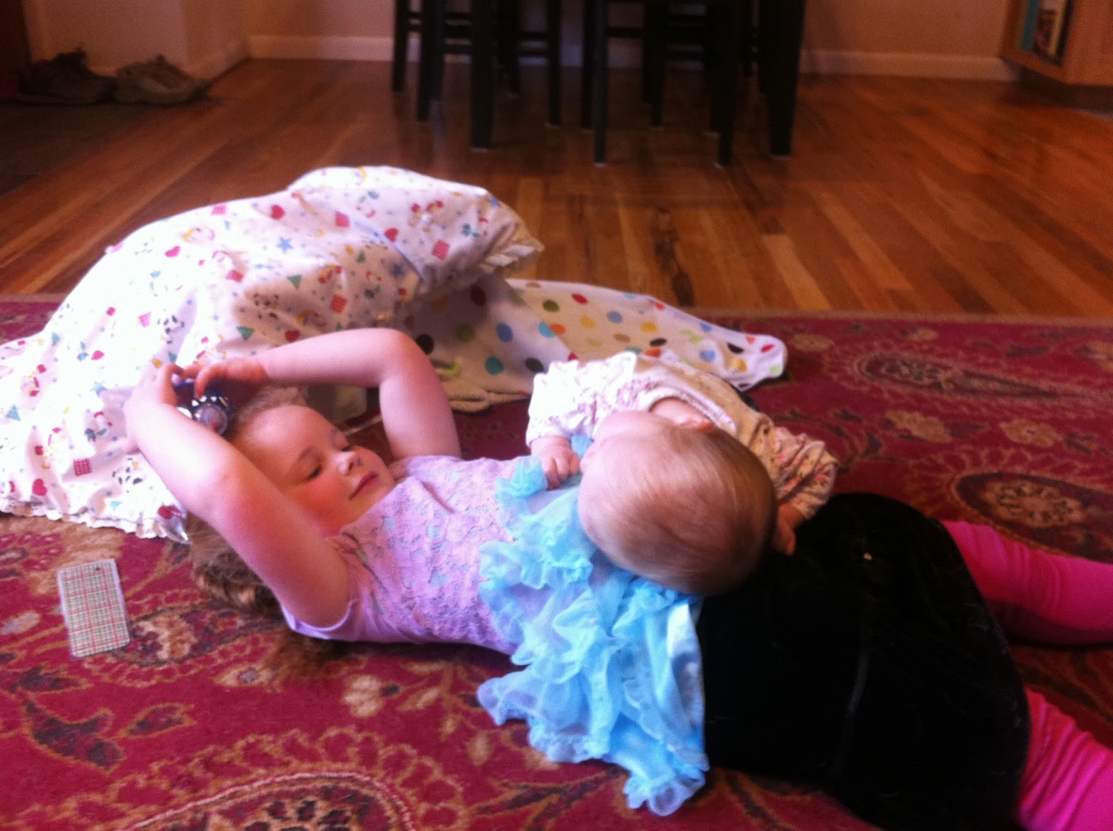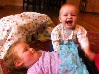 But they also fight over toys already. Tessa, now mobile, will go over to Maggie’s project and steal something. And Maggie snatches things back and gets nearly hysterical when Tessa comes for her toys. We talk a lot about trading and negotiation and patience. And Tess has learned from her vocal sister the art of the scream. Mags is still sometimes too rough and Tessa still likes to pull hair. But usually we just hug it out and so far everyone definitely still loves each other.