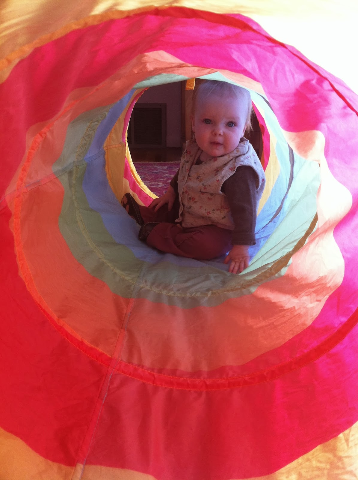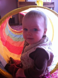 Tess has started to mimic behaviors, which is super cute. She’ll put a brush up to her hair, the play phone to her hear, a hat on her head. Actually she kinds of aims for her head and tosses the hat and it goes flying behind her, which is probably cuter than getting it right. She’s just started to get the “more” sign at meals and kind of touches her fingers together while saying “mo.” She doesn’t understand “finished” yet, but that may be because she hardly ever wants to stop eating. She’ll clap if you clap, point if you point, pat the dog if you pat, and, still my favorite, laugh if you laugh.