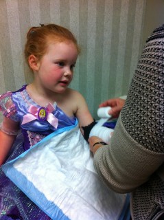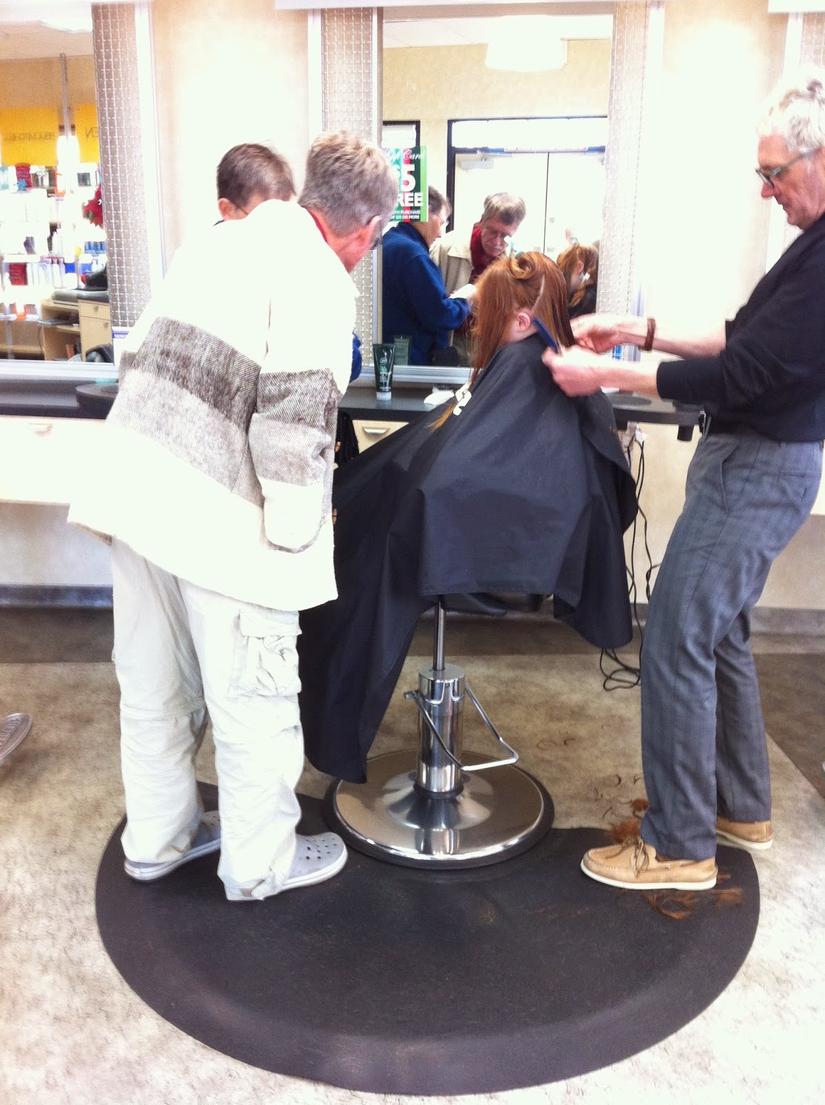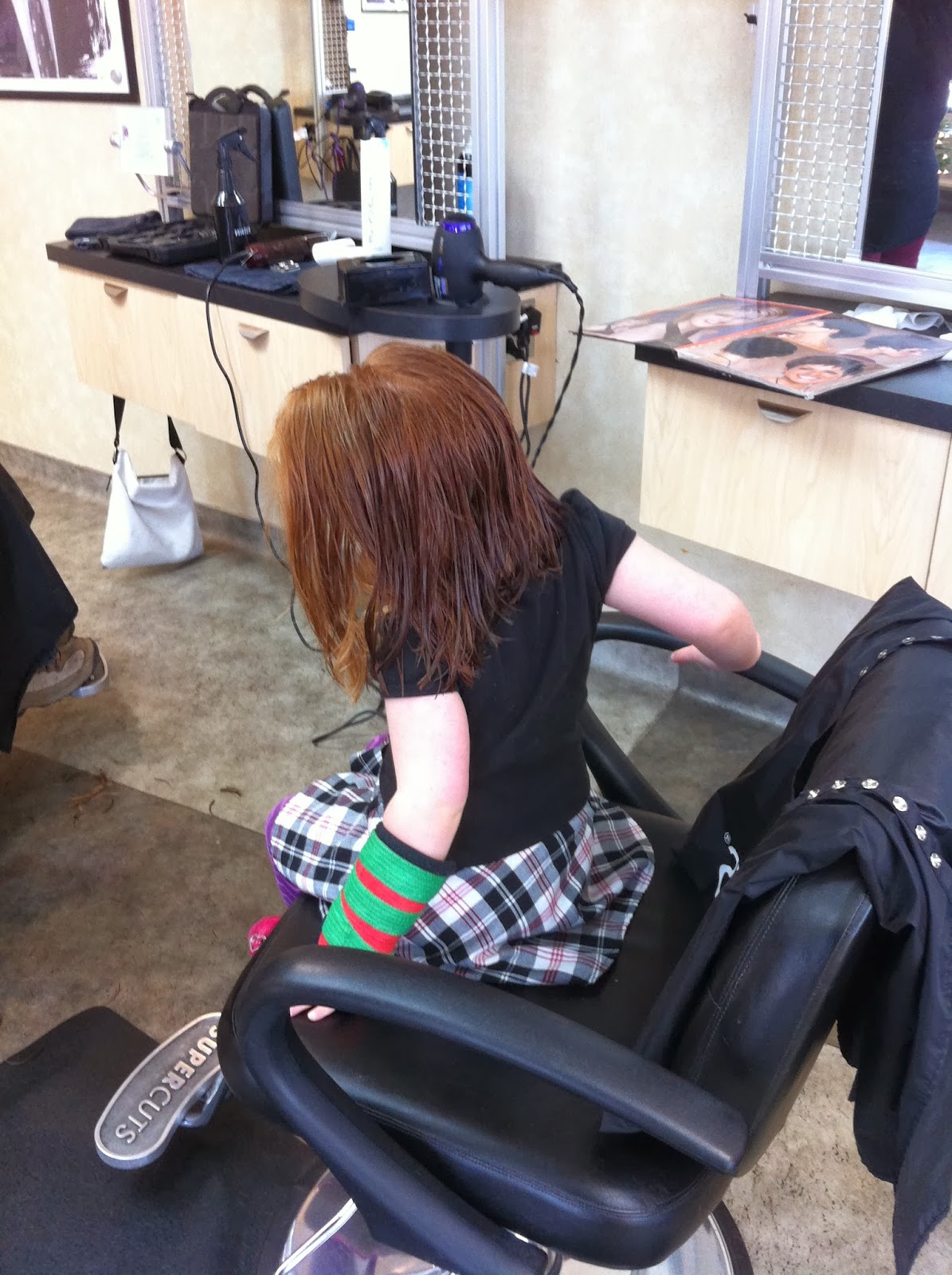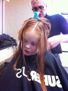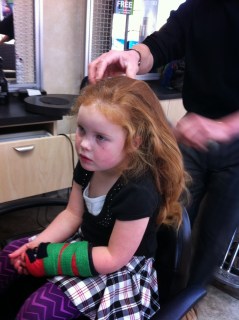 And then Maggie consented (barely) to going to the hair salon and getting her hair cut! They took off about 5 inches and she was very brave, with the help of a piece of candy and a cookie. The man who did her cut (the hair waitress, in Maggie’s words) wasn’t exactly the paradigm of cheer or mirth, and didn’t seem like he especially knew what to do with a kid, but we all did our best to ooh and ahh and encourage and now she is (still) just adorable! It has revolutionized our morning routine; we no longer start out the day fighting. It is part of her morning chores now — to brush her own hair.