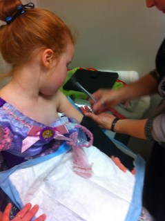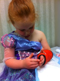 fell down wrong. We went to urgent care the next morning when she was still being super careful with it. They x-rayed and determined she has a buckle fracture. She will tell you her bone goes whoopdewoo, but bones are supposed to be straight. This was the last day of school before winter break so we dropped in to pick up all Maggie’s things and so she could tell her classmates about the ordeal. A few days later we went to the orthopedist and they put on a hard cast, although we talked them down from one that would have gone above her elbow. So far, it has stayed on, has not given anyone a concussion, and has not slowed her down one bit. Unless we’re talking about stuff that Maggie doesn’t want to do alone, in which case her cast is a terrible burden and she needs a parent to help her mightily.