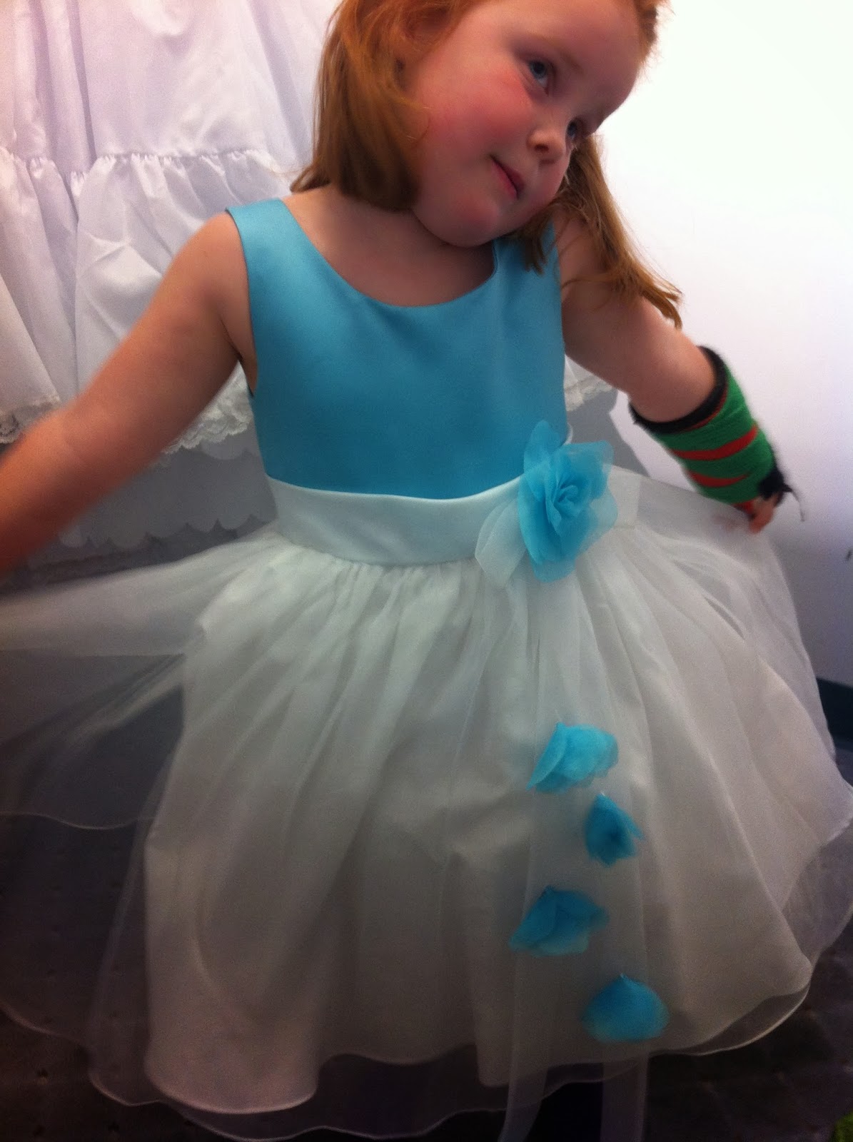 We also went to a bridal store to try on a dress. Maggie is soon to be a flower girl for Bill’s brother’s wedding, and she is dreading it, as you can see. Either that or she is in hog heaven.