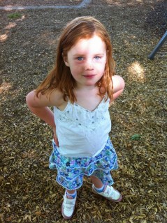 There are times when Bill and I look at each other and wonder who’s genes are to blame for certain things. She’s back to refusing to go to school since they made it a rule you have to wear shorts underneath skirts and dresses. (Of course she still goes and has a wonderful day and doesn’t want to come home.) There are nights when she strides out of her room at 9:30 and asks for more books to read in bed and then at 5:15 the next morning she’s saying she’s bored of being in her room. Her obstinancy is starting to win out over our motivation to teach her how to swim and how to ride a two-wheeler. And she’s doing that charming kid thing about eating boogers (even after I told her they are her body’s trash, just like poop). Oh, and she’s teaching her sister wonderful things like screaming in the house and splashing bathwater all over the floor and eating without hands or utensils.