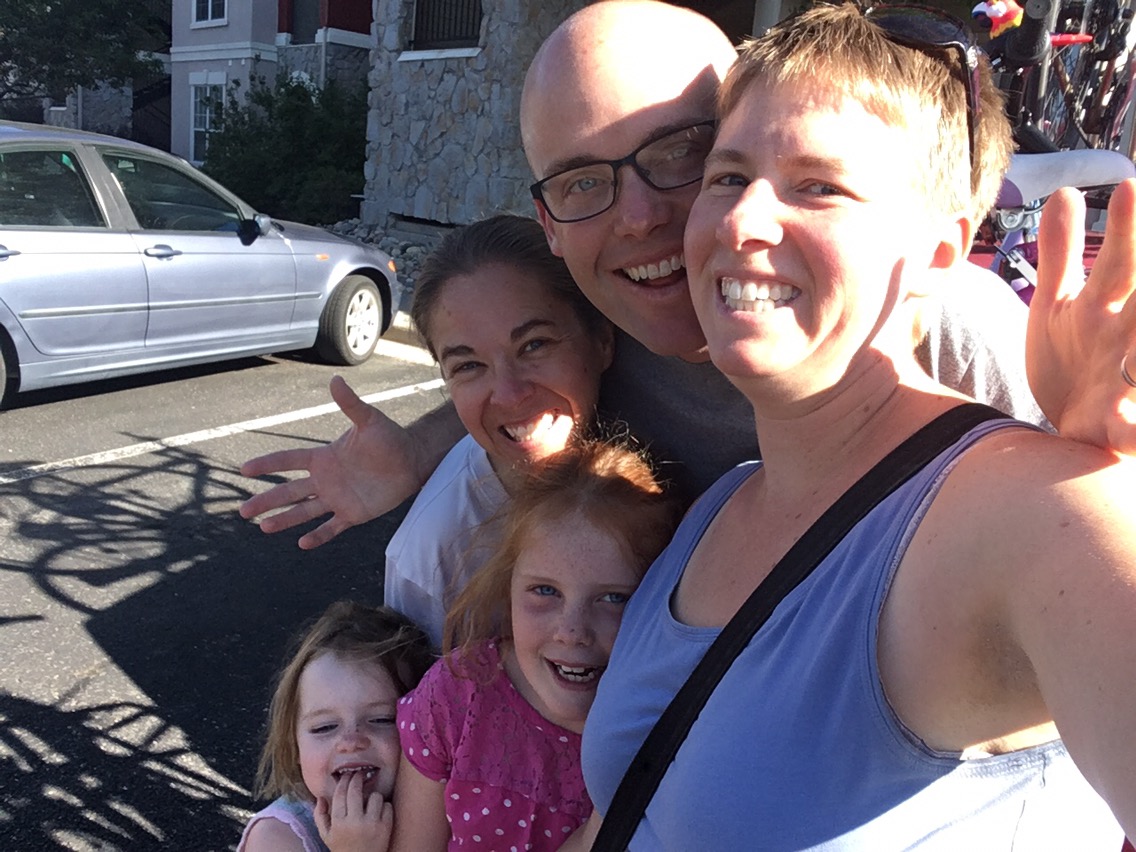 Despite my seeming grimace and the shadows under the girls’ eyes, we are having fun so far. Thank you, Baci (aka Aunt Annalise), for giving us your bed to sleep in, for braving the outdoor pool with the kids, for letting them scatter the contents of your bookshelf, and for sharing the complete contents of your refrigerator!