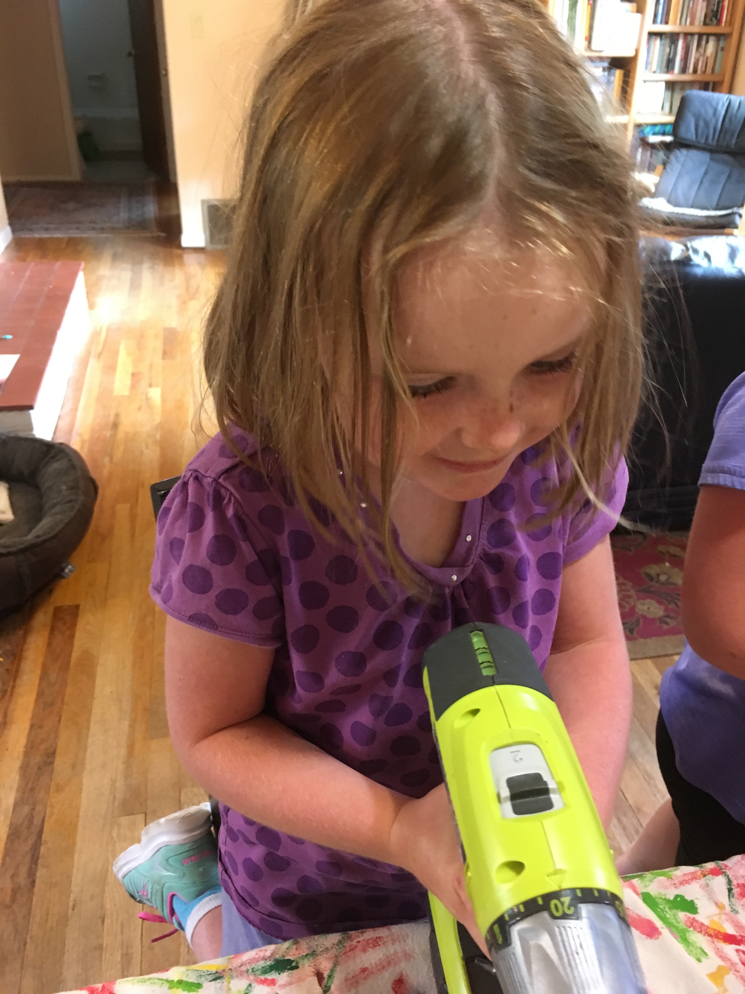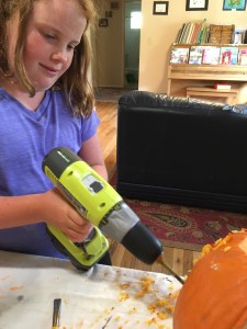 Turns out, a drill (versus a knife) is actually a safer way for small hands to carve a pumpkin. In my opinion, now that I’ve tried both. Although, it does kind of shoot little squiggles of pumpkin all over the house. But the final product was cool!