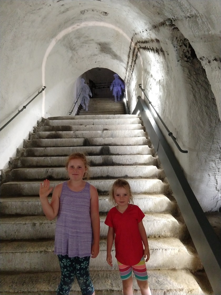 The visitor center was awesome and had multimedia presentations (in English) on the history of the town from its limestone formation to demilitarization in the 1970s. The coolest thing was the guided tour of the tunnels that snake underground all over the hill. We got to explore 1.5 km of the chilly labyrinth, hearing about the Spanish, the French, the Austrians, the Dutch, and the Belgians who have added to the citadel and tunnel network over the centuries. Again, it was a pretty amazing multimedia performance and definitely the girls’ favorite part of the day!