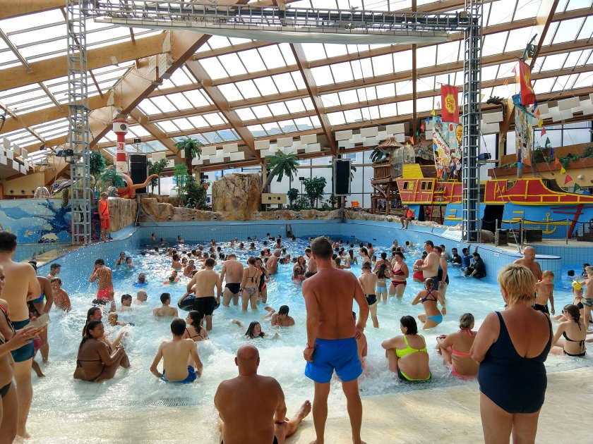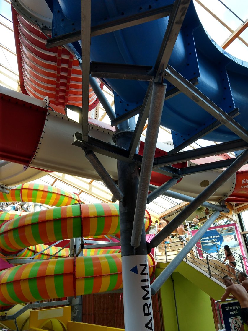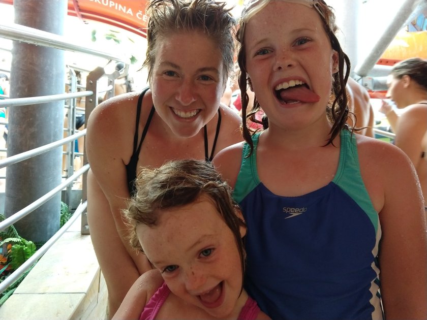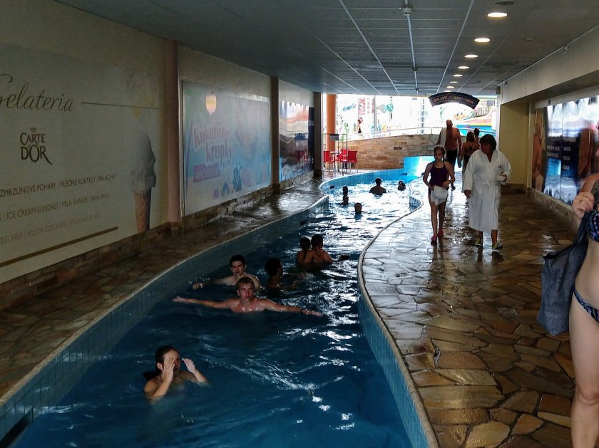 We chose amazing water park. This place was huuuuge. Several lazy rivers (why walk through the large complex when you could swim between buildings?), a wave pool, kids splash areas (indoor and outdoor), a swim-up bar. And lots and lots and lots of slides. Like, at least 12, including the Czech Republic’s longest. Favorites were Canyon (which goes outside for part and includes a rapids section to bounce and spin and dunk and terrify mom joyous swimmers); Chocolate Drop (in which the slide dumps you in a huge bowl that you go around until you drop down the hole in the middle — picture those penny-racing funnels in the zoo and imagine you’re the penny); Black Hole (pitch black except for occasional dim lights above you); Tube-y (also pitch black but with a partner on a double inner tube); Speed Slides (see the videos below — they felt much faster than they look); and The Lame One (mom’s favorite easy ride).