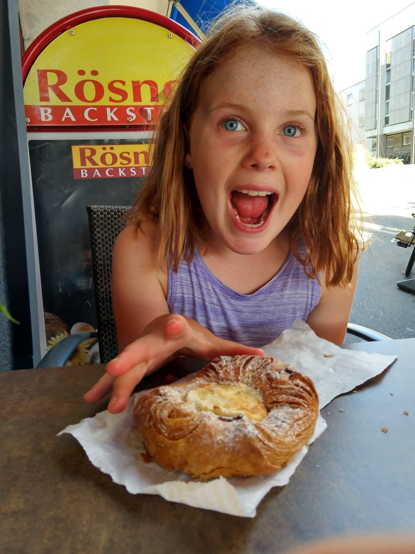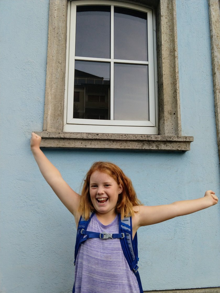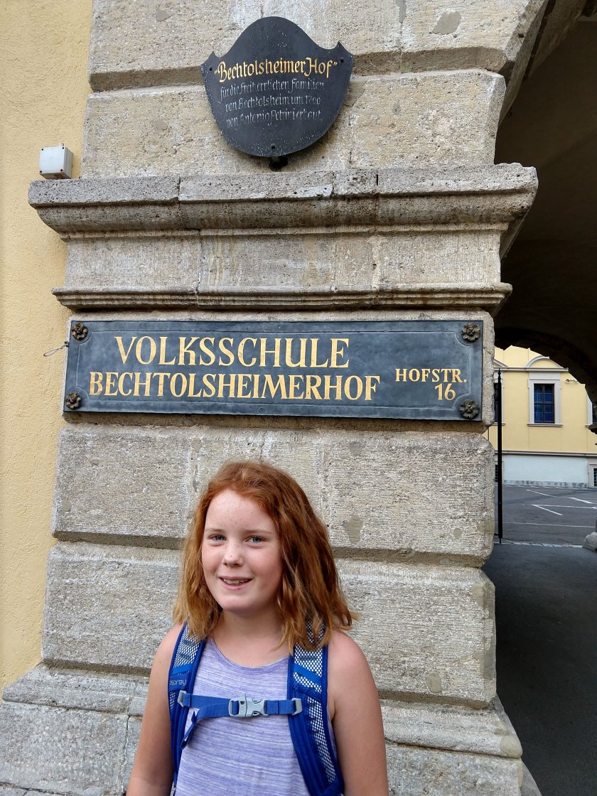 (Maggie was much less nervous than I expected; she admitted to “an eighth” of being scared. Her teacher, Frau Spahn, speaks some English and seated her next to a bilingual girl from Texas. After-school club — which starts directly after lunch — proved a success as well. Apparently sidewalk chalk is a universal language. Now comes the hard part: deciphering the school supply list. And convincing Maggie that a pastry for morning snack is not viable for everyday.)
