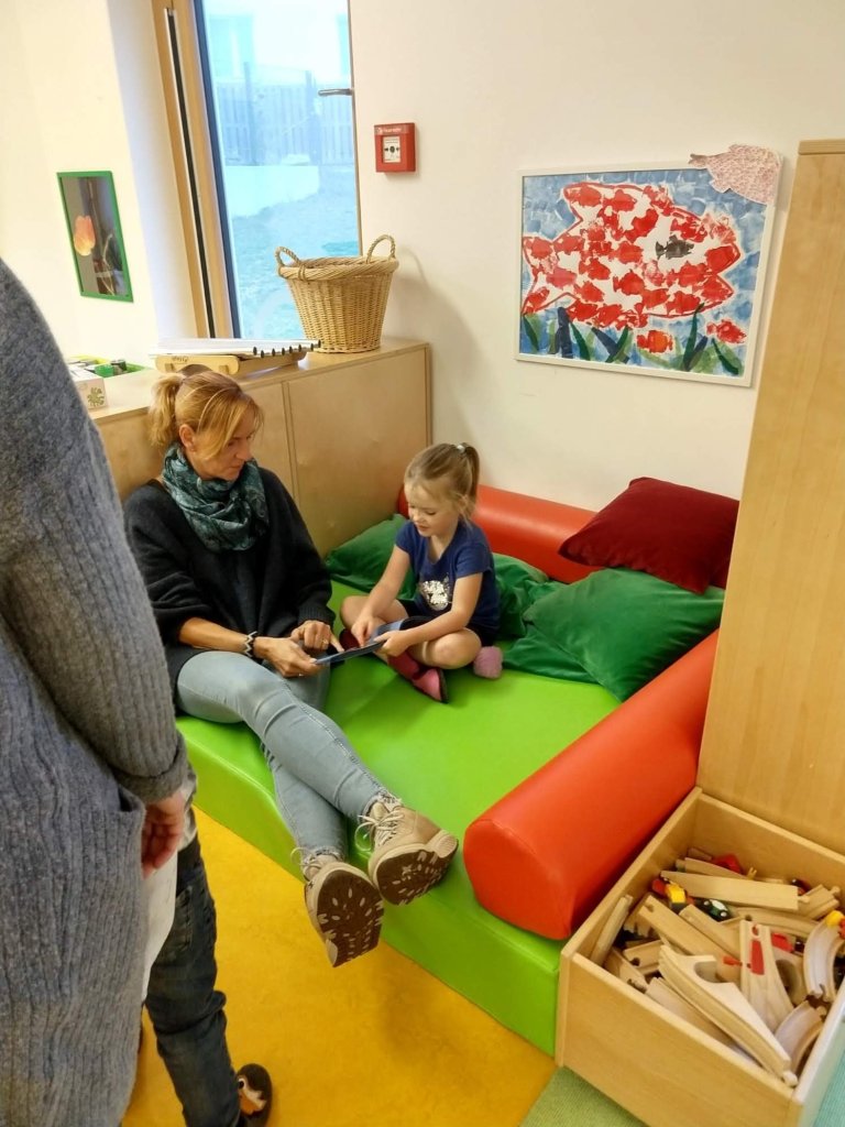 Best thing, according to Tessa? The food! 2 bowls of cereal for morning snack, noodles and vegetables for lunch, and peanut butter bread in the afternoon. Oh, and there’s a big doll house for regular-size dolls. Plus scooters on the playground! Hard to beat!