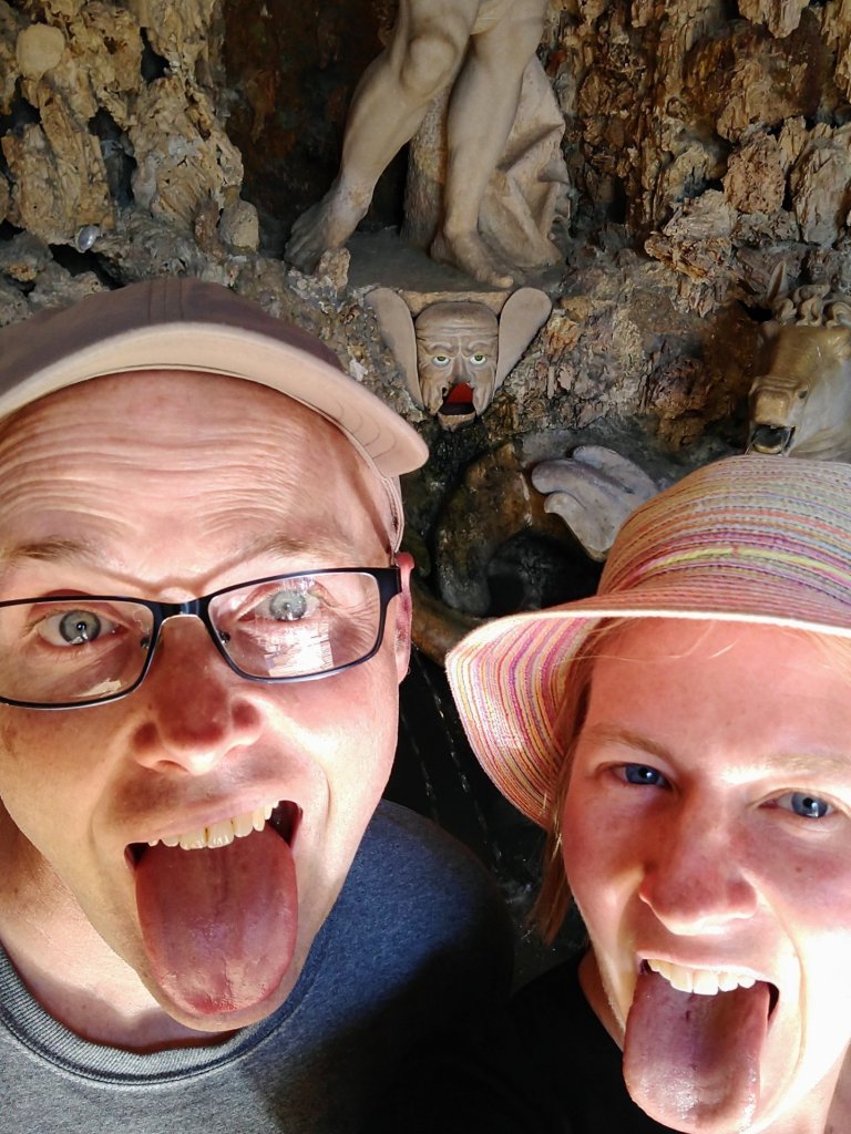 So, the palace grounds are built on natural springs, and the archbishop (who must have had a good sense of humor) used water pressure to pull pranks on his garden guests. There were pretty cool things like statues with moving parts (the guy below sticks his tongue in and out), an entire miniature theater of 138 moving figurines with water-powered organ music, a floating golden crown. And also sprinklers on the paths and in the garden walls that turn on quite by surprise! Some of the tour guests were less than thrilled, but we thought it was great fun!