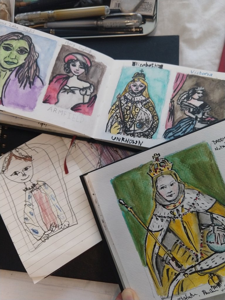 Bill took the girls on a sketch crawl at the National Gallery and National Portrait Gallery one day. (There’s still boring things that have to happen, like Mom paying bills and buying train tickets and doing laundry, even on grand adventures.)