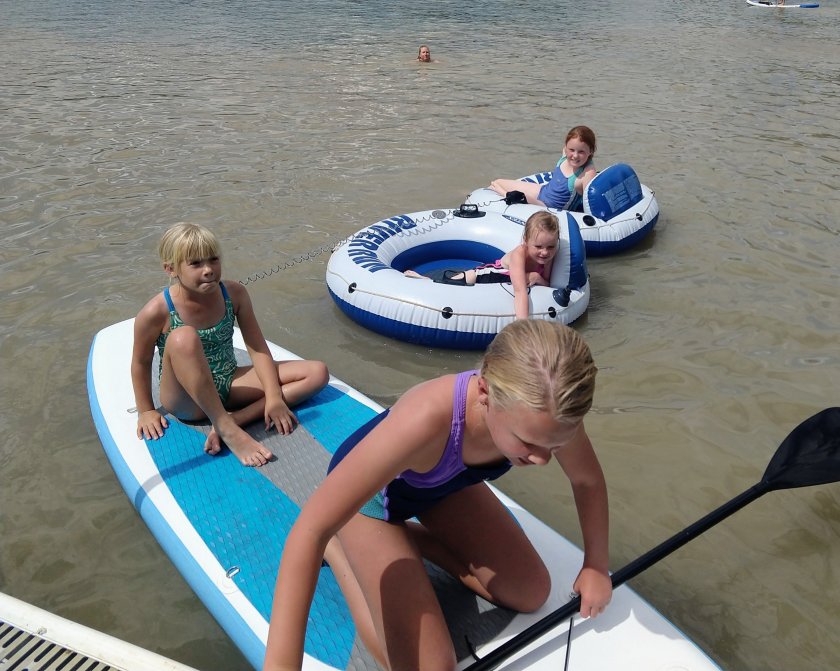 We drove 5 minutes out of town to the lake that was opened while we were gone. Our friends joined us with their borrowed paddle board and we (unsuccessfully) tried to avoid sunburn. (We were there for 4 hours and applied twice!)