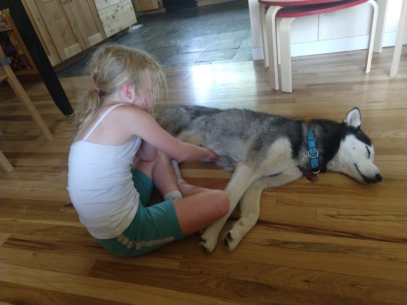 She’s cuddly and likes to be pet, even on her legs and feet and ears. She’s always excited for a walk or hike and is good on a leash. She doesn’t bark, doesn’t startle, doesn’t mind a gaggle of kids poking her all at once. She sleeps in the corner on her bed, all night long. She likes other dogs and plays well with our best puppy friend. If we could get her to happily eat anything besides hot dogs, she’d be absolutely perfect!
