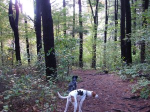 The trail went up. It went down. It went through foresty forest. It went through piney forest. It went past rocks and ponds. And there were only a couple of other people out. The dogs scampered and snarfed and generally ran amok, obviously enjoying themselves and getting all tangled up in their leashes.