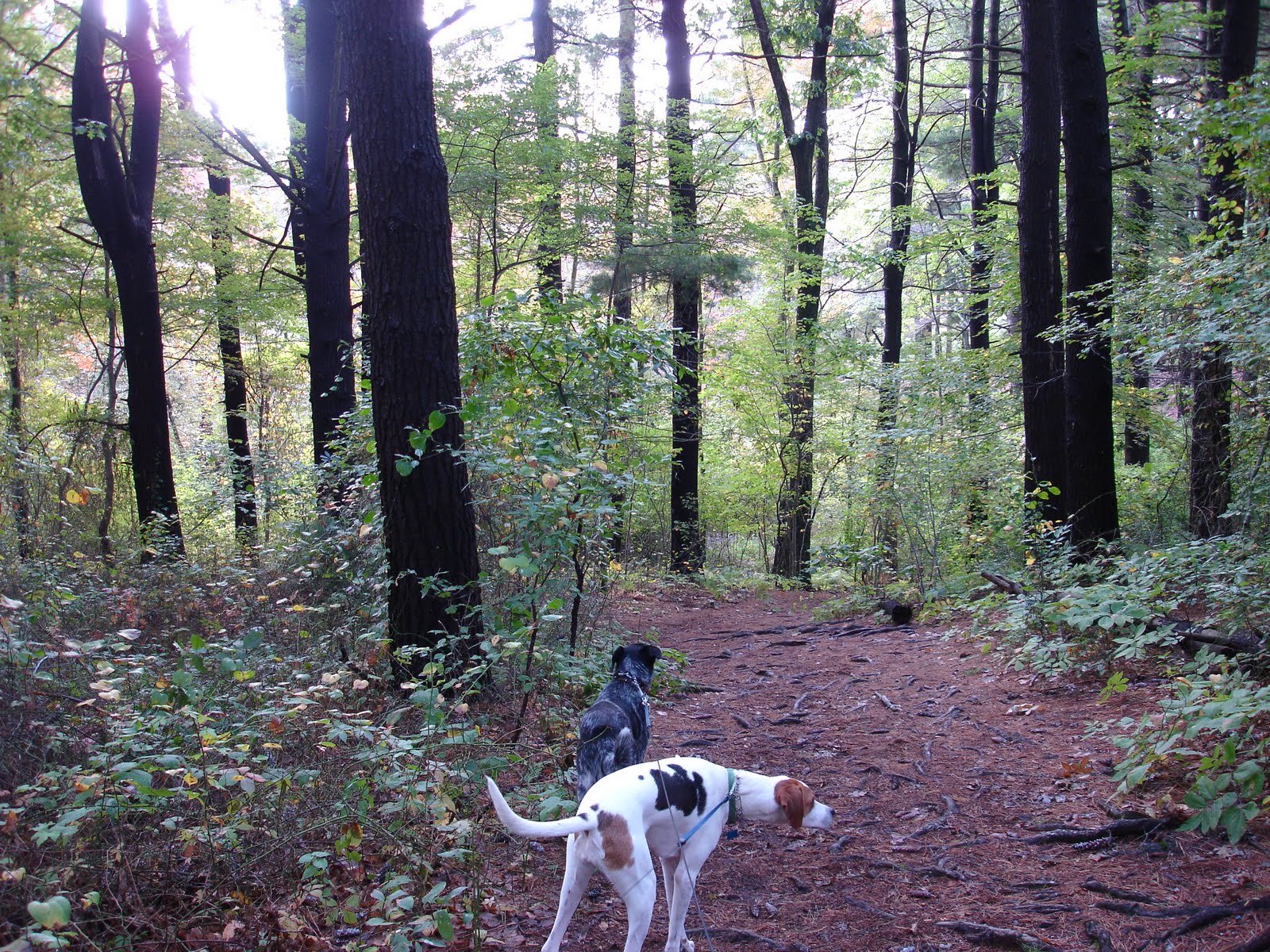 The other day Bill and I took the poochies for a walk in the Blue Hills. It was a pretty perfect fall day. Warm enough for shorts and a T-shirt while walking, a little breeze, fall colors just beginning to dominate. It had been cool enough in previous days that there were no mosquitoes to pester us or spiders to build their webs across the path.