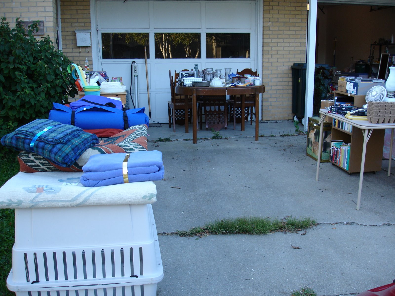 This is what the driveway looked like on Friday when I drove off to work, leaving poor Heidi and her mom and grandmother to wheel and deal for us. I did make one sale on Friday morning: 3 tiki torches and the fuel to go with them for $3. Luckily, the point was to get rid of it all, and so every sale they made — and almost 75% of everything was sold by the end of the day — was cause for a little celebration. (Well, for us anyway. Every sale they made was for them one less sale they had to make.)