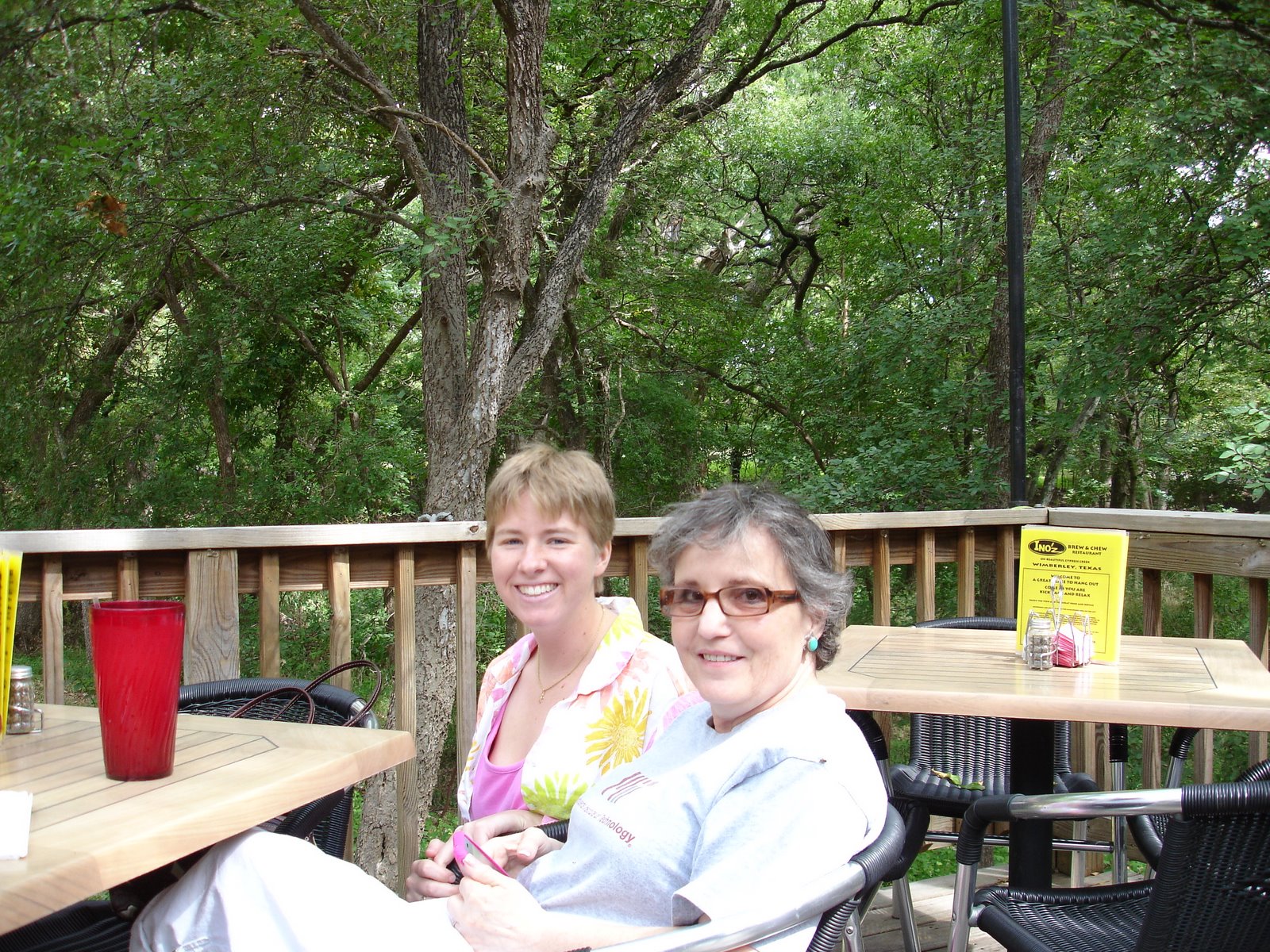 And so we did. On Monday, with the cruiseline finally seeing reason and throwing in the sombrero, Sue and I drove ourselves around the Hill Country, making our way to Fredericksburg, Texas. We stopped for cowgirl boot shopping and lunch in Wimberly, Texas. We found a restaurant next to the creek . . . so it’s almost like we’re on a cruise . . .